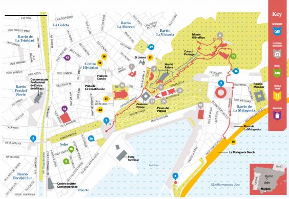From the nearby mirador (14) you can zig-zag your way downhill, following a rough pathway until you reach a paved street and can make for the richly decorated bullring (7). Continue towards the water and sand of La Malagueta – Malaga's city beach.